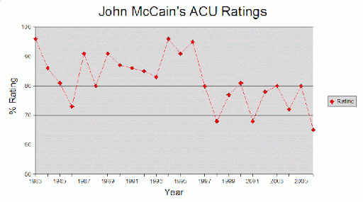Thus starting in Mr. McCain's House time, and votes contrary to what the ACU supported are listed (Year - ACU percent - comments), all ratings from the ACU Ratings site and I am doing my best to de-conflict the votes for on a proposal against and such [note that non-votes are on ACU cited votes, not of all votes taken]. This list is representative of their views which are biased and I do disagree with a number of their takes and backing, but it is a fair view from a given biased perspective of how to grade Congresscritters: